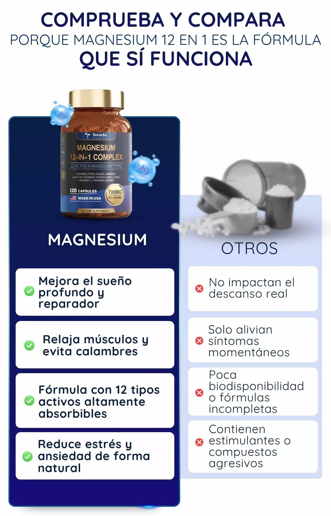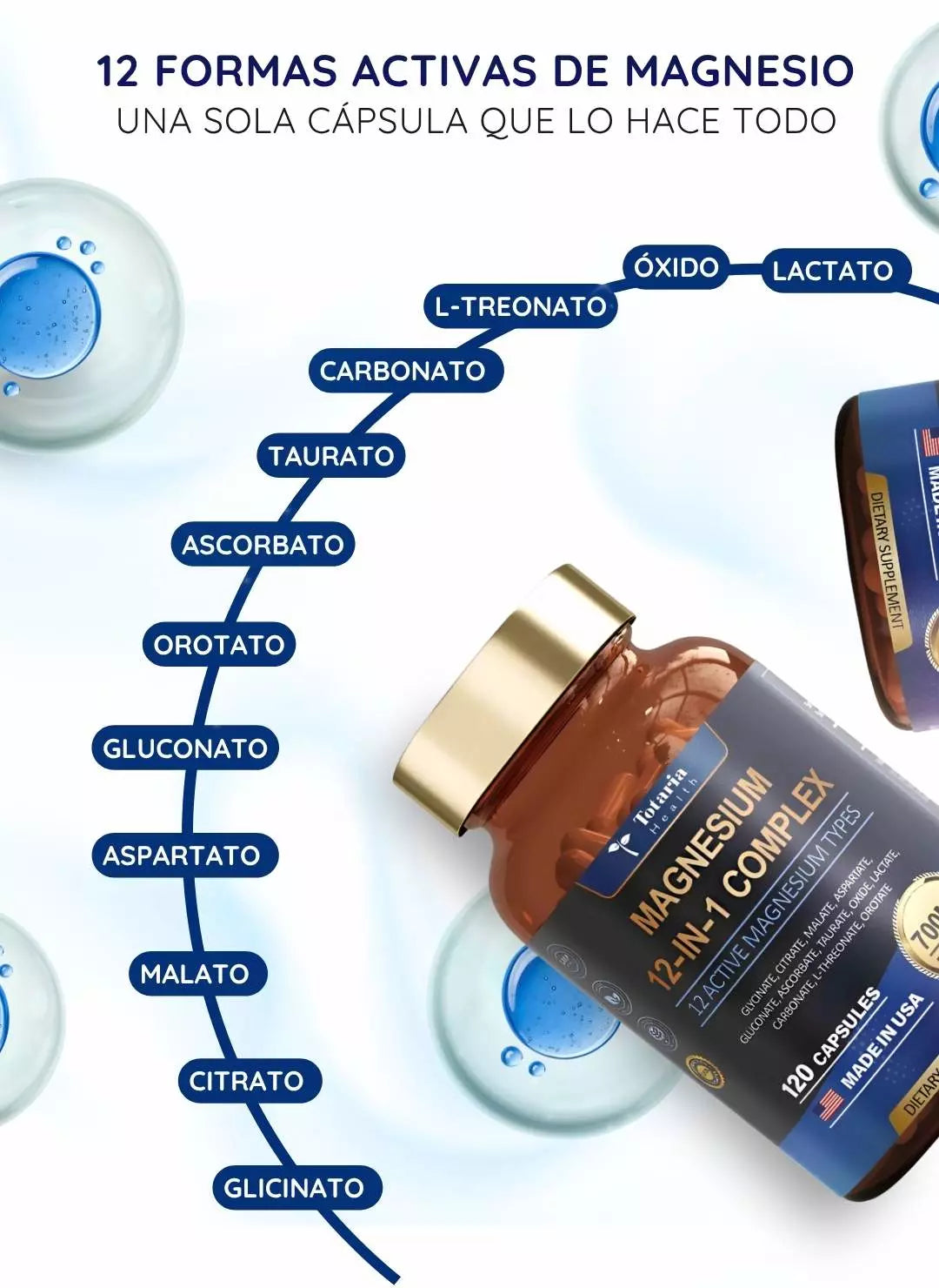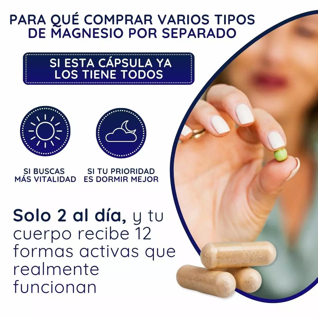 No. Esta fórmula integra 12 tipos activos de magnesio en una sola mezcla, diseñada para ofrecer soporte integral.